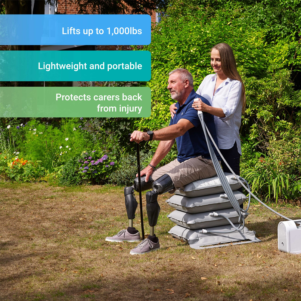 If someone falls over and they can shuffle on to the cushion or be rolled on from the recovery position and assisted to sit upright then the Elk can then be inflated at the touch of a button with someone supporting the individual from behind to bring them to a raise seated position ready to stand.