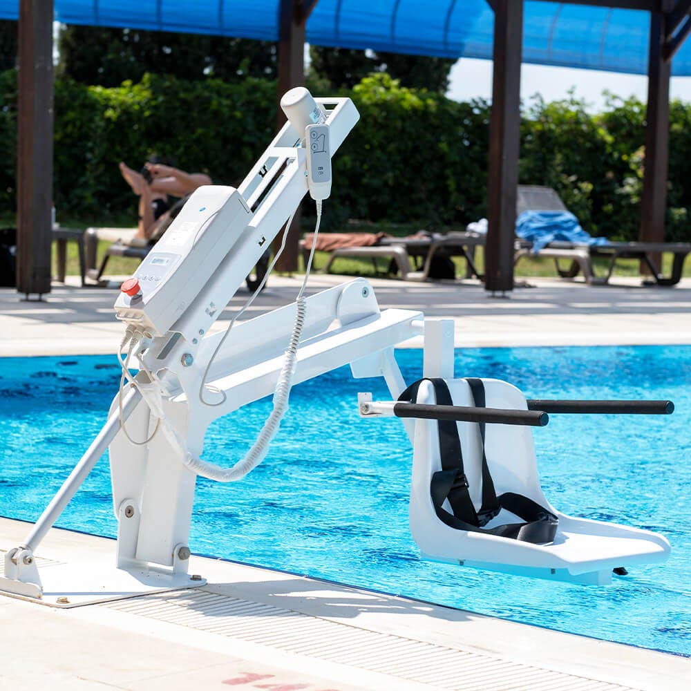 This modern and inviting pool lift ensures safe entry into in-ground pools and hot tubs, making it an ideal access solution for various settings, including leisure centers, holiday resorts, spas, hotels, and private homes.