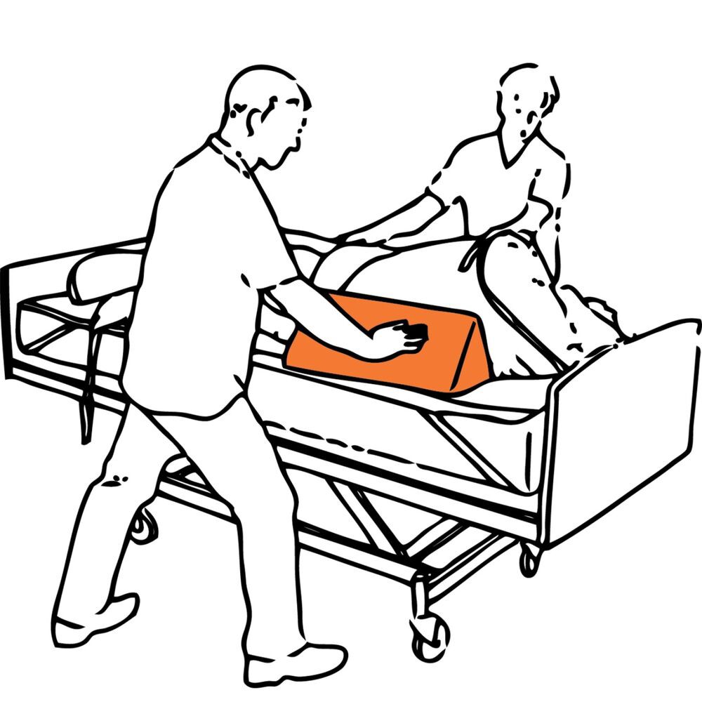 Immedia Positioning Wedge supports the user on the side after turning, when resting or when performing hygiene or wound care, saving the caregiver from maintaining a static holding position.
